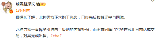 不过,根据媒体人赵探长的报道,北控男篮正求购王岚嵚,已经先后接触辽宁与同曦。